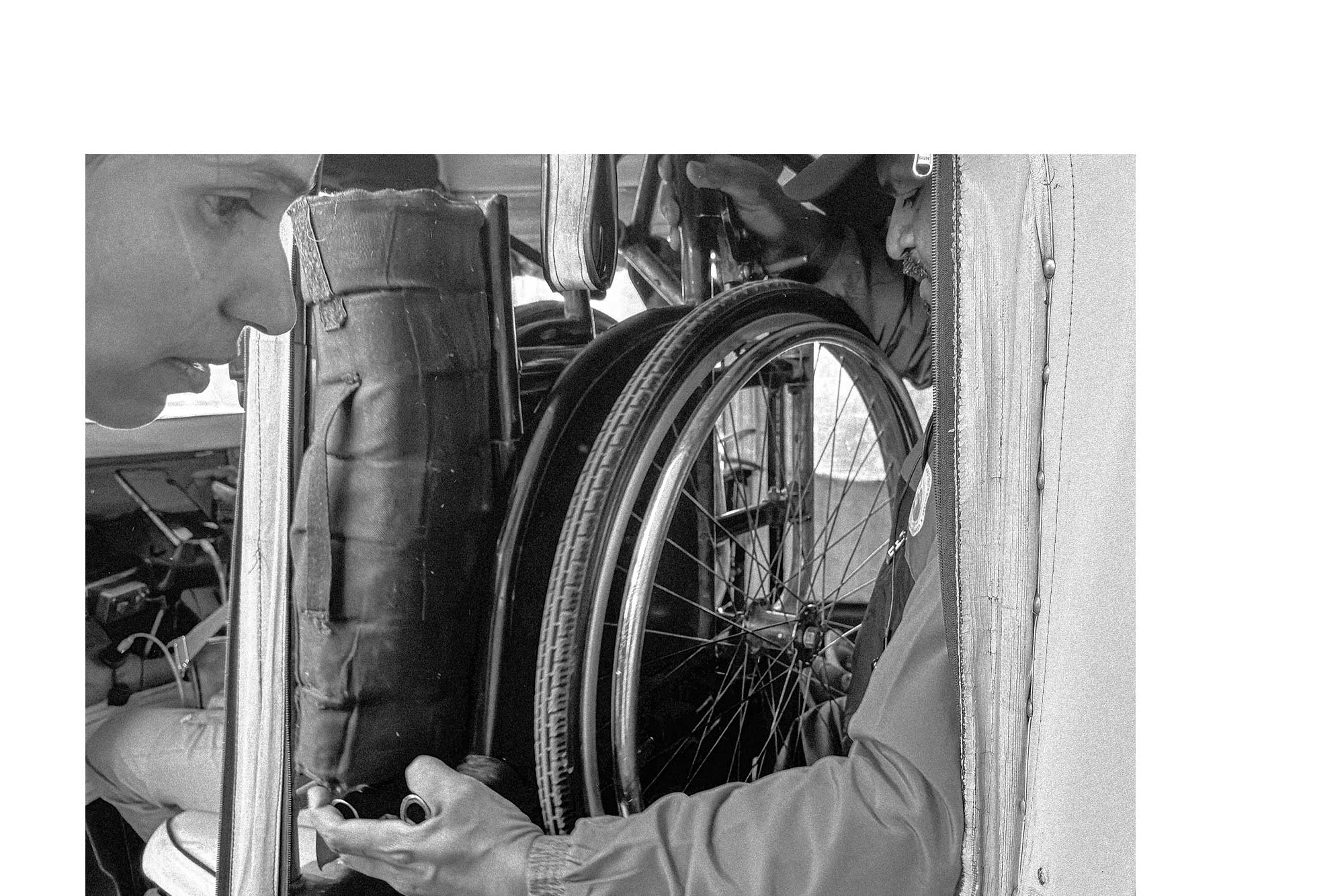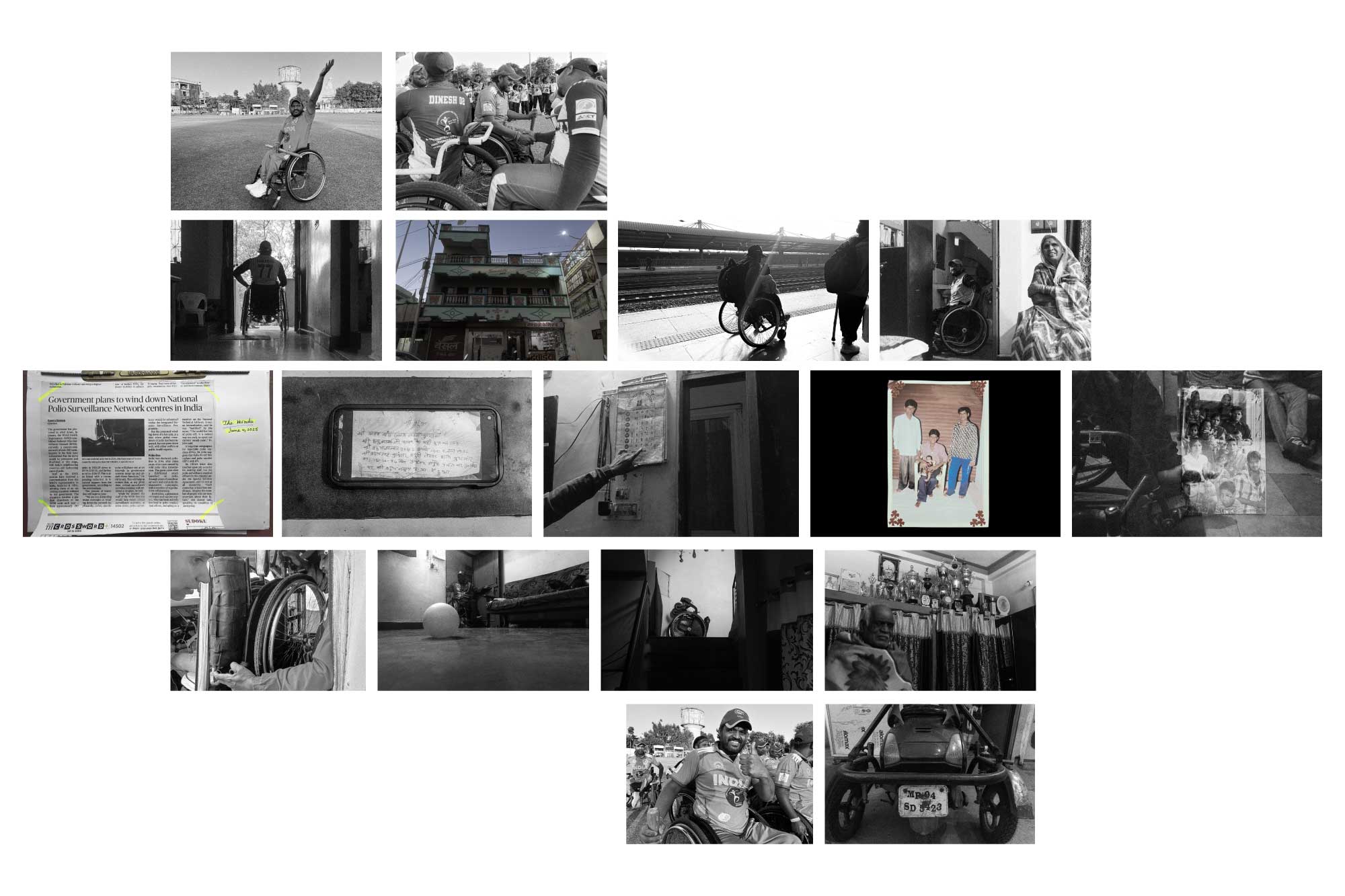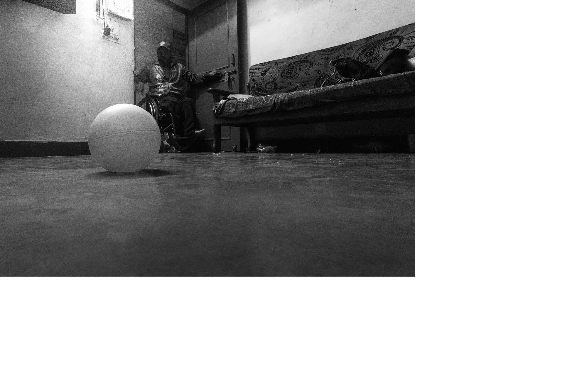 Moments of play are deliberately underplayed. Instead, the photographs dwell on preparation, waiting, travel, domestic spaces, and recovery—sites where the economic reality of sport without capital becomes visible. The wheelchair appears not as a symbol but as an everyday apparatus, embedded in routine. By normalising its presence, the work challenges dominant visual tropes that either romanticise disability or reduce it to pity.